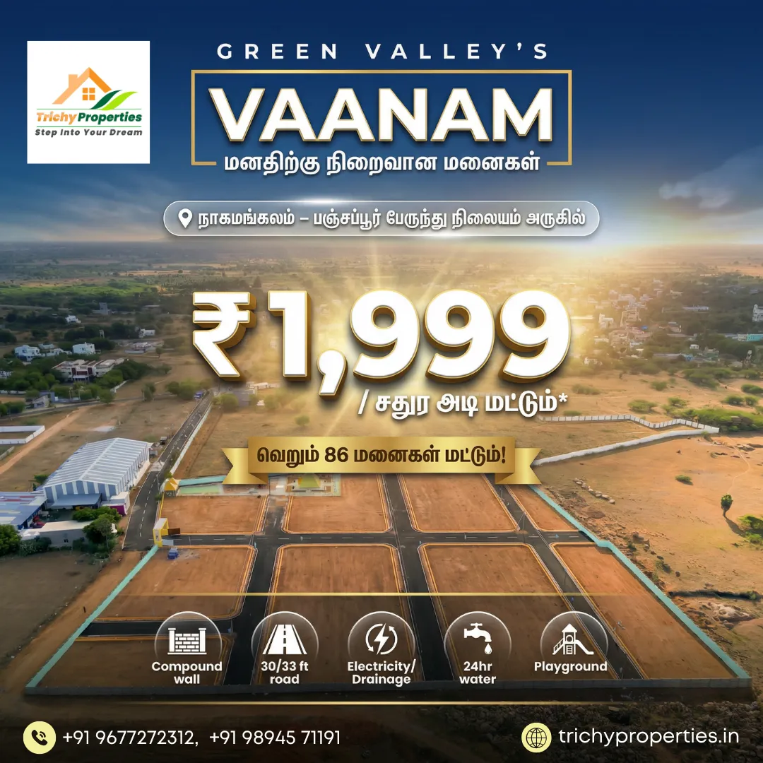 Vaanam is a premium residential layout by Trichy Properties, offering well-planned plots with modern amenities and convenient access to essential services in Trichy.